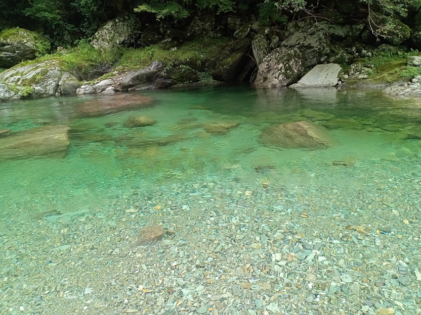 手前の宝来荘がある駐車場の下でも、川の水が綺麗でした。